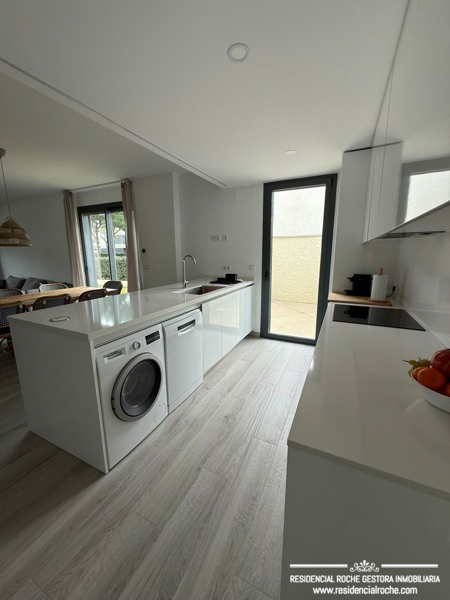 Planta baja: Un dormitorio con dos camas individuales y baño en suite. Recibidor y aseo de cortesía, salón con televisión, un amplio salón principal muy luminoso con grandes ventanales y acceso directo al jardín y a la piscina, cocina totalmente equipada, zona de comedor con mesa de gran tamaño y acceso a un pequeño lavadero.